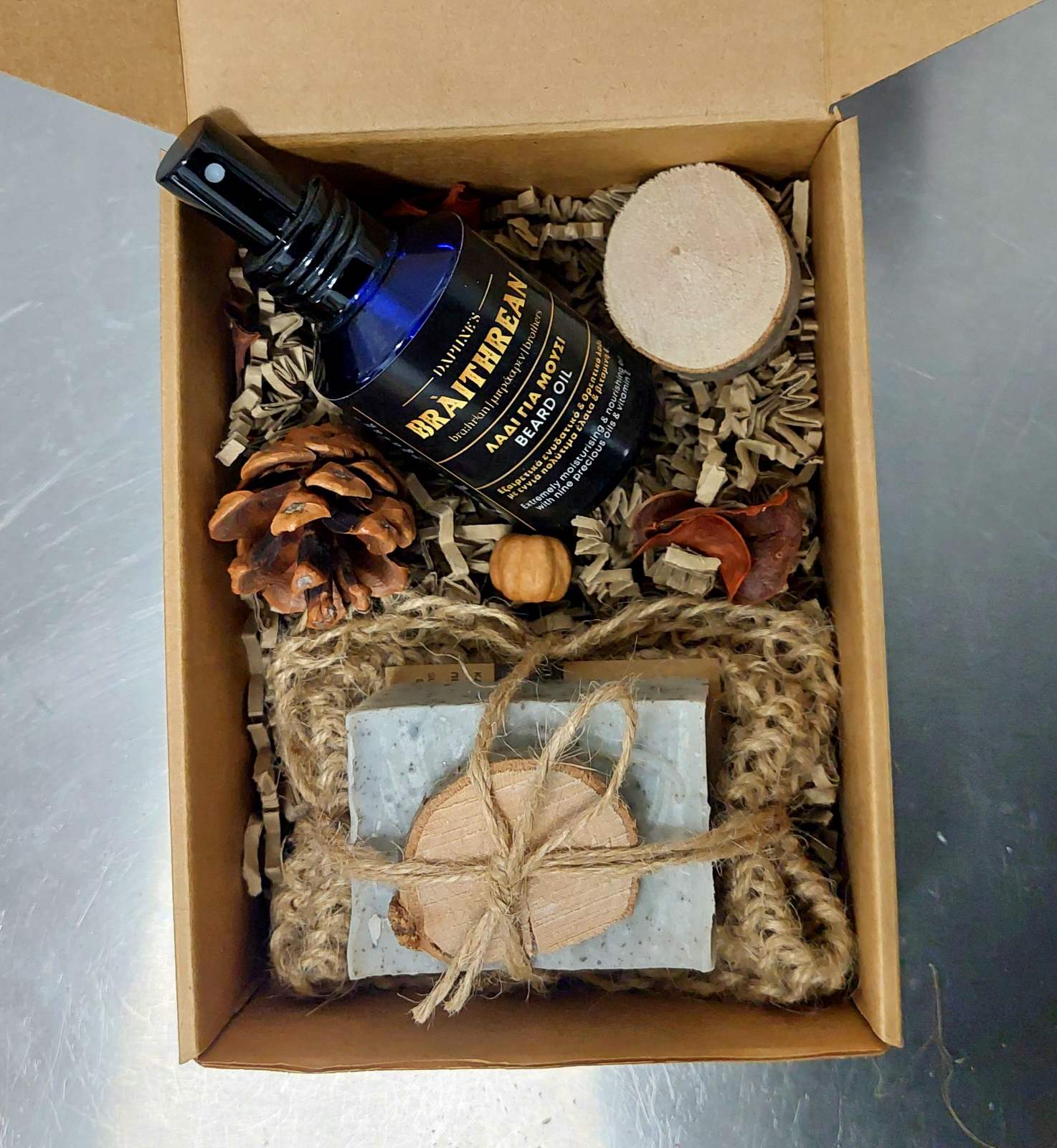 Λάδι για το μούσι, σαπούνι “Bitterlake” και πουγκί από φυσική γιούτα. Περιέχονται σε κουτί τύπου κραφτ, διακοσμημένο με οικολογικά υλικά και εξωτερικά φέρει κορδέλα. Η διακόσμηση και η κορδέλα ενδέχεται να διαφέρουν σε σχέση με της εικόνας, καθώς πρόκειται για χειροποίητο προϊόν και το κάθε πακέτο είναι μοναδικό.